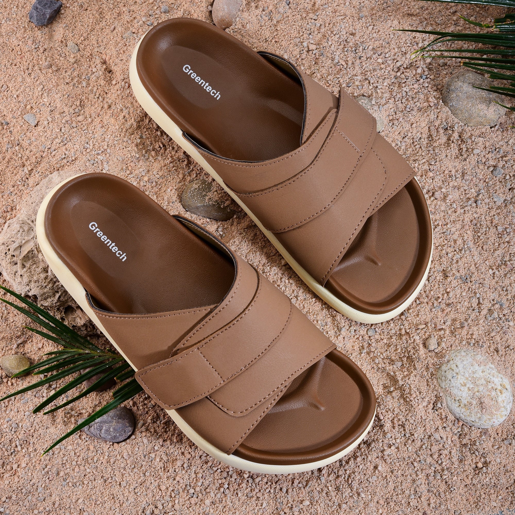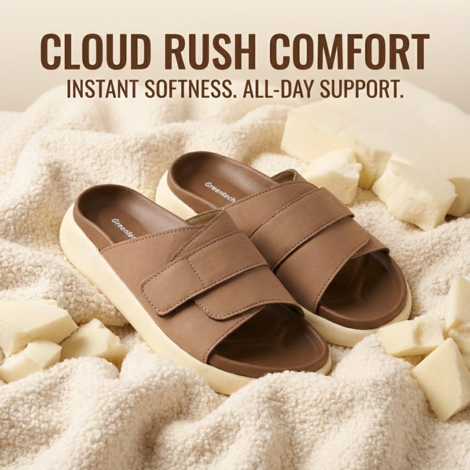 Step into a new era of walking comfort with the Greentech Cloud Rush™ Velcro Slides, designed to make every step feel weightless. This premium collection features our signature thick Cloud Platform Sole, engineered to provide superior shock absorption and high-rebound cushioning that significantly reduces foot fatigue during all-day wear. Unlike standard slides, the Cloud Rush offers a fully customizable fit thanks to its broad, adjustable Velcro strap upper, ensuring unparalleled security for narrow, wide, or high-arched feet alike. Crafted with a deep, contoured footbed that cradles your arch and a sleek, premium matte finish, these sandals perfectly bridge the gap between orthopedic-grade support and contemporary streetwear style—making them your essential go-to for effortless, stylish daily luxury.