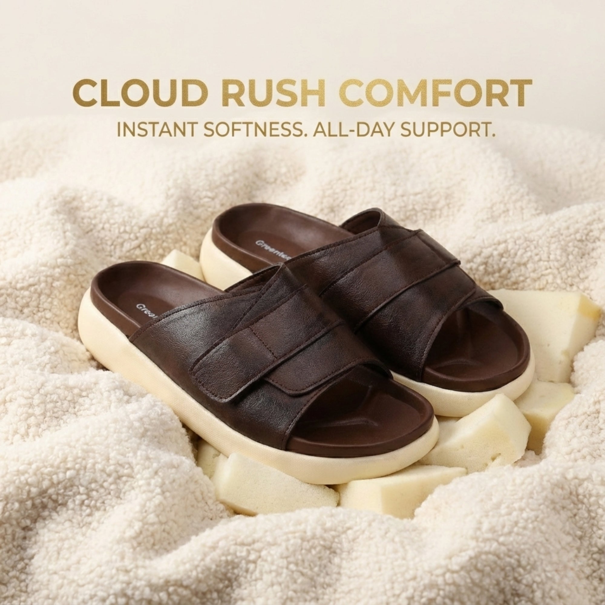 Step into a new era of walking comfort with the Greentech Cloud Rush™ Velcro Slides, designed to make every step feel weightless. This premium collection features our signature thick Cloud Platform Sole, engineered to provide superior shock absorption and high-rebound cushioning that significantly reduces foot fatigue during all-day wear. Unlike standard slides, the Cloud Rush offers a fully customizable fit thanks to its broad, adjustable Velcro strap upper, ensuring unparalleled security for narrow, wide, or high-arched feet alike. Crafted with a deep, contoured footbed that cradles your arch and a sleek, premium matte finish, these sandals perfectly bridge the gap between orthopedic-grade support and contemporary streetwear style—making them your essential go-to for effortless, stylish daily luxury.